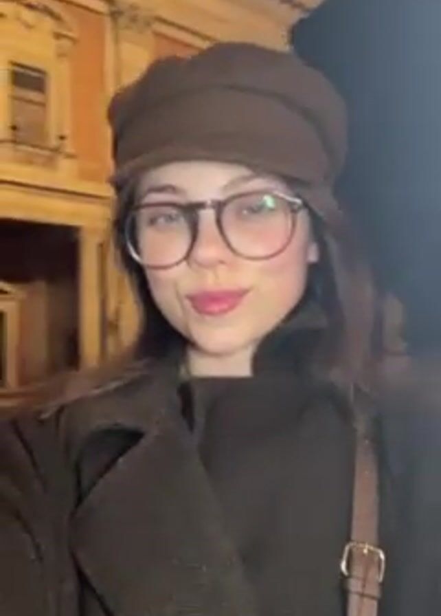 A young woman stands outside at night in front of a building with a cream-colored façade and decorative pillars. She is wearing a brown newsboy cap, round glasses, and a dark brown coat with a strap of a bag visible across her shoulder. She has fair skin, and her hair is parted and falls around her face. She smiles slightly at the camera. The building behind her is lit, and a street lamp is visible to the right of the frame.