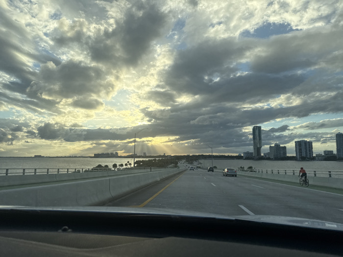 The image depicts a westbound view from inside a vehicle on the Rickenbacker Causeway in Miami, Florida, United States, overlooking Biscayne Bay towards the Miami mainland, specifically the Brickell/Downtown skyline. The scene is illuminated by a low sun, possibly setting, positioned towards the west-southwest and partially obscured by a dramatic, heavily clouded sky, producing distinct crepuscular rays. In the foreground, the dashboard of a vehicle is visible. The roadway features multiple lanes of asphalt, marked with white dashed lines and a double yellow line. Several passenger vehicles, including sedans and SUVs, are observed traveling in the same westbound direction on the causeway. To the immediate right of the main vehicular lanes, a concrete barrier separates the road from a dedicated path. On this path, a single individual wearing a red shirt and dark pants is riding a bicycle westbound. Beyond the path, another concrete barrier separates it from the water. The midground features the expansive waters of Biscayne Bay. Along the immediate shoreline on the right, a narrow strip of land with sparse palm trees is visible. In the background, across the bay, the urban skyline of Miami's Brickell/Downtown district is clearly identifiable, characterized by numerous high-rise buildings, including one particularly tall, slender skyscraper. Streetlights are positioned along the causeway. The overall lighting suggests either late afternoon or early morning due to the low angle of the sun and the interplay of light and shadow created by the dense cloud cover.