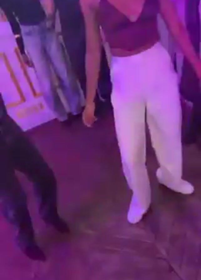 A dance floor with several people dancing, lit in purple and red. A person wearing a maroon top and white pants is moving in the center of the frame. Another dancer is wearing black pants. Other people are visible in the background, some in casual clothes like jeans, and another in a white traditional outfit. The dance floor appears to be wood.
