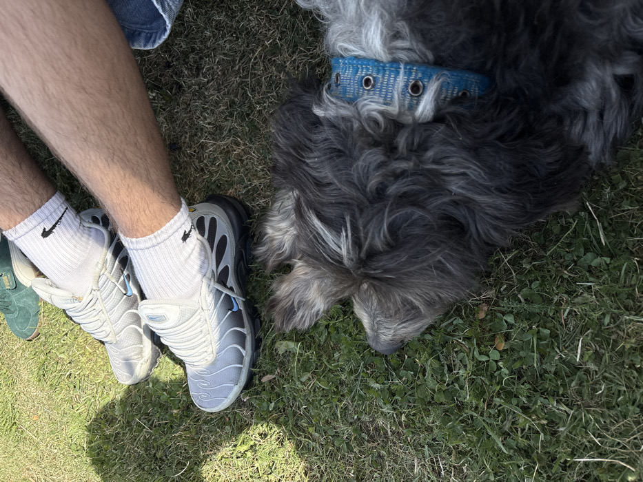 A person's legs in athletic shoes and white socks rest on grass. A large, gray, long-haired dog with a blue collar lies beside the person's feet. The grass is green and interspersed with patches of dry grass. A glimpse of another green shoe is visible to the left. Jeans are present in the upper-left corner of the image. The dog appears to be resting its head on the grass.