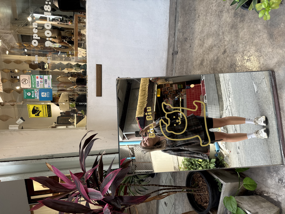 The image displays an outdoor scene adjacent to a retail establishment in Chiang Mai City Municipality, Thailand. A large, unframed rectangular mirror stands vertically on a grey concrete surface, positioned off-center to the right. Affixed to the mirror's surface is a yellow outline drawing of a stylized, cat-like creature. The mirror reflects a young adult female, clad in a plaid long-sleeved shirt, black cycling shorts, white socks, and white athletic shoes. She holds a smartphone in her right hand, extended towards the mirror, and has her lips pursed in a "kissing" expression, indicating she is taking a self-portrait. Behind her reflection, a street scene is visible, including a building with "Biu Biu" text in yellow and a lower section of red tiling. To the left of the mirror, a tall potted plant with dark reddish-purple leaves rests in a black pot on a concrete planter. A smaller green plant is visible at the bottom left. The background features the glass facade of the shop. Various operational stickers are visible on the glass: a yellow "CCTV 24 ชั่วโมง" (CCTV 24 hours) sign, a green "KBank WE ACCEPT" sticker displaying Visa, Mastercard, JCB, and UnionPay logos, a red "NO SMOKING" sign, and Alipay and WeChat Pay logos. Shop hours, "Open Sun 9:00-18:00," are also present. Through the glass, display items, possibly jewelry or decorative objects, are visible, along with a partial view of a person inside the shop. Woven spiral decorations hang within the shop window. A dark rectangular plaque is affixed to the wall below the shop window.