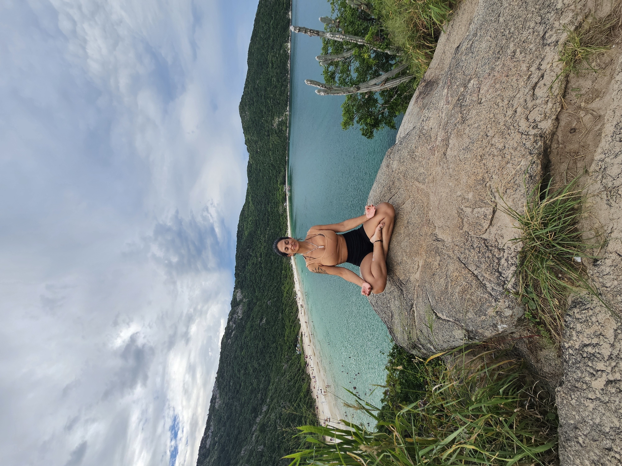 The image depicts a female in her 20s or 30s seated in a lotus position (Padmasana) on a large, textured gray-brown rock outcrop in Arraial do Cabo, Brazil. She is positioned in the immediate foreground, looking directly at the camera with a slight smile. She wears a light brown sports bra and black shorts, with a light-colored pendant visible on her chest and tattoos on her left arm. Her hands rest on her knees, fingers forming a mudra. The scene overlooks a scenic bay. In the midground, a crescent-shaped white-sand beach (Praia do Forno) is visible along the curve of the bay, populated by numerous small figures of individuals in the sand and clear, turquoise-blue water, indicating recreational activity. The bay's water transitions to a deeper blue further from the shore. Beyond the beach, densely vegetated green hills rise steeply, forming the natural backdrop of the bay. To the immediate left and right of the subject and rock, green grasses and other foliage are present. On the right side, several tall, columnar cactus-like plants with a weathered appearance are visible among the green vegetation. The sky above is partly cloudy, displaying a mix of light and dark gray clouds with patches of blue. The overall lighting is diffused.