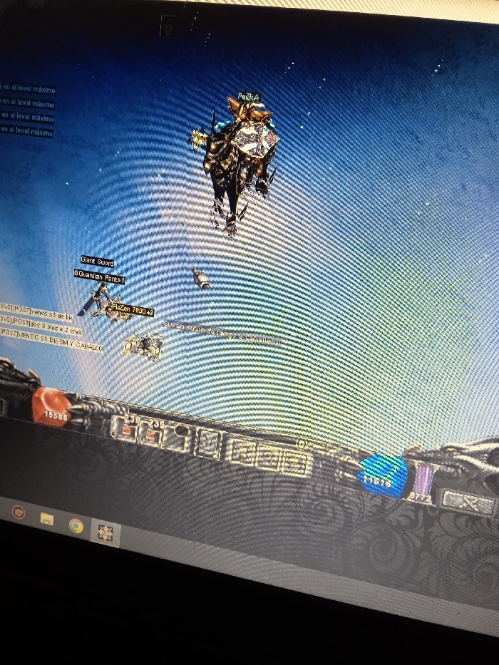 The image displays a photograph of a computer monitor exhibiting a video game screen with visible scan lines/moire patterns. The primary scene within the game is a virtual environment, not a physical location in Macho Muerto, Venezuela. The central element of the game screen is a large, dark, ornate armored character labeled "PeckA" floating or standing against a blue, star-speckled background. Below this character, several in-game items are visible: a "Giant Sword," "Guardian Pants," a "FLZen 7800 +3" item, and an unidentified cylindrical object. The user interface (UI) elements are present around the game world. In the upper left, multiple lines of Spanish text state "en el level máximo" (at the maximum level). Below this, chat or system messages in Spanish include references to trading items, such as "[SV2][POS] vendo s1 de bk," "[SV2][POS] doy 8 bles x 2 crea," and "[POST]VENDO S1 DE SM Y CABALLO." A dark, textured UI bar spans the bottom of the screen, featuring a red box containing "15588" on the left, several square inventory or skill icons in the center (some with numbers like "239" and "235"), and a blue circular icon with "11515" and a purple bar with "8772" on the right. A small portion of a real-world operating system taskbar, including Google Chrome and other icons, is visible along the very bottom edge of the physical monitor.