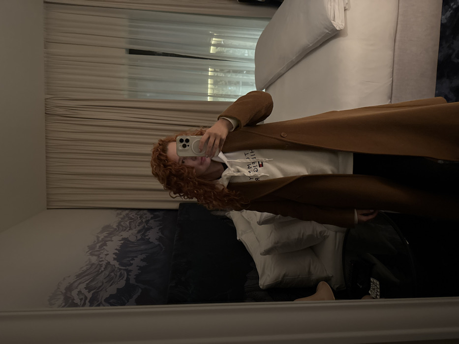 A red-haired female is depicted in a mirror selfie within a modern hotel bedroom, assumed to be located in Budapest, Hungary. The individual wears a white hooded sweatshirt displaying the "TOMMY HILFIGER" logo, layered under an open, long, caramel-brown coat. Her lower body is clad in dark trousers. She holds a light-colored smartphone with a visible MagSafe ring directly in front of her face, obscuring her nose and mouth, while her eyes are directed towards the camera. The room environment features a large bed with a dark upholstered headboard and white bedding, including multiple pillows and a long bolster pillow on the right side. Behind the bed, a significant portion of the wall is covered by a dark blue and grey mural depicting abstract, wavy, or mountainous patterns. To the right of the bed, a window is draped with full-length, light-colored curtains, with subtle external lights discernible through them, indicating an evening or nighttime setting. A dark nightstand is partially visible to the left of the bed, containing indistinct items. The floor is covered by a dark patterned carpet. The overall lighting is dim, sourced from artificial, warm-toned ambient fixtures. No other individuals or interactions are present in the scene.