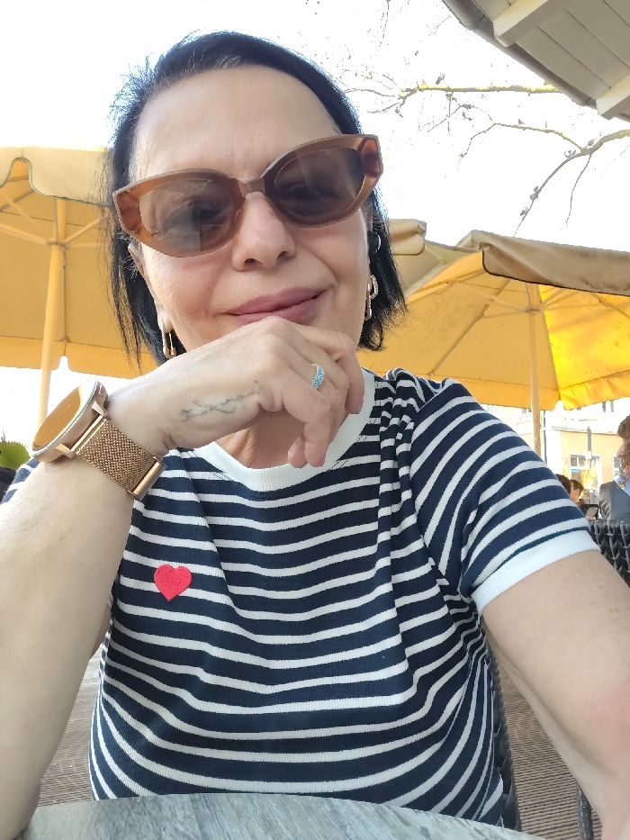 An adult female is depicted in a close-up, outdoor setting within the city of Kehl, Germany. She has dark hair, wears brown-tinted sunglasses, and a navy blue and white striped short-sleeved top with a white trim. A small red heart emblem is affixed to the left side of her shirt. On her left wrist, she wears a rose-gold colored smartwatch with a metallic mesh band. A ring with light blue stones is visible on her left ring finger, and a tattoo is present on the side of her left hand. Small, gold-colored earrings are worn on both ears. Her right hand is positioned near her chin, and she is looking directly at the camera with a slight smile. The immediate foreground shows a light-colored table surface. The background features multiple light yellow/beige patio umbrellas, bare tree branches against a bright sky, and indistinct structures and figures indicating a public outdoor area, likely a café or restaurant patio, under daylight conditions.