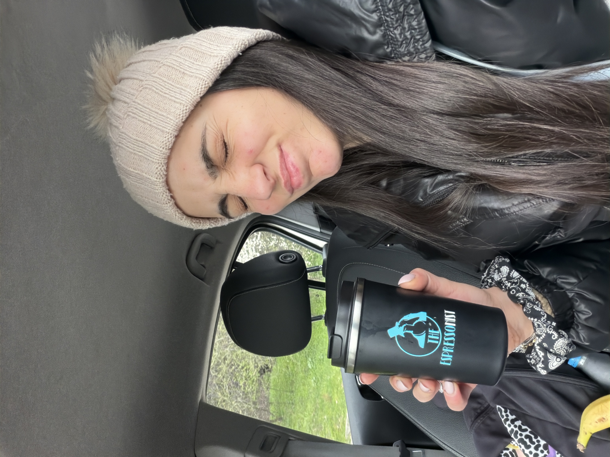 A woman wearing a cream-colored beanie and black jacket is sitting inside a car. She is holding a black mug with a blue logo that says "The Espressionist." Outside the car window, green grass and trees are visible. The location is in Sofia, Bulgaria.