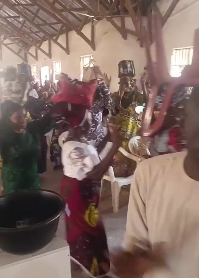 group of people in what appears to be a church hall. Most of them are women, wearing colorful African print dresses and headwraps, some carrying items on their heads. They are dancing and raising their hands in the air. In the foreground, there is a man dressed in casual clothes moving towards a black bowl placed on a white stand, possibly collecting donations. The hall has a high ceiling with exposed wooden beams and white walls. There are white plastic chairs arranged in rows and visible windows. The lighting is bright. The video seems to be taken with a handheld phone camera.