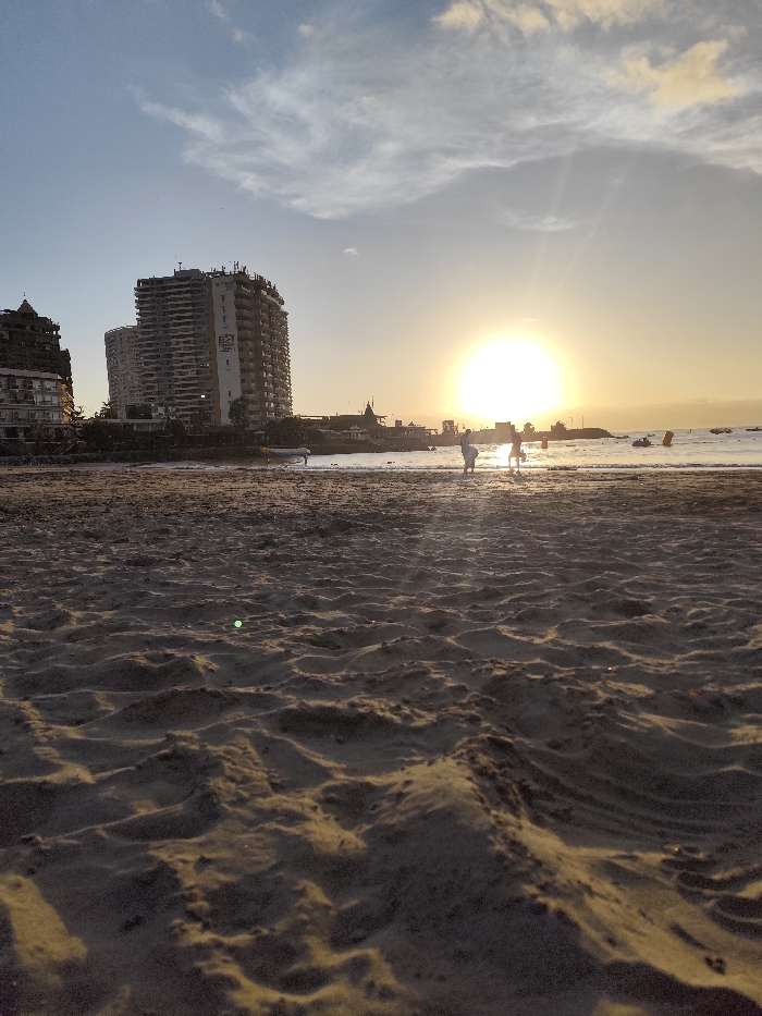 This image depicts a beach scene at sunset in Iquique, Chile. The foreground is dominated by textured, light brown sand with visible ripples and undulations, illuminated by the low sun from the right. A small green artifact, possibly a lens flare, is present on the sand in the mid-left foreground. The midground features the ocean's waterline, reflecting the bright sunlight. Several human figures are present near the water, visible as dark silhouettes against the bright sun; two prominent figures appear to be walking in the shallow water or on the wet sand. In the water, to the left, a small, light-colored boat or personal watercraft is partially visible, while several dark shapes with orange buoys or markers are further out on the right, suggesting additional watercraft. The background reveals a coastal city skyline under a partly cloudy sky that transitions from light blue at the top to a bright golden hue around the sun. A large, intense sun is positioned low on the horizon, slightly to the right of center, emitting a strong light. To the left, several tall, multi-story buildings, consistent with urban coastal architecture, line the shore. One prominent building has a large "32" graphic on its side. Other smaller structures and land formations are visible along the distant coastline between the buildings and the setting sun.