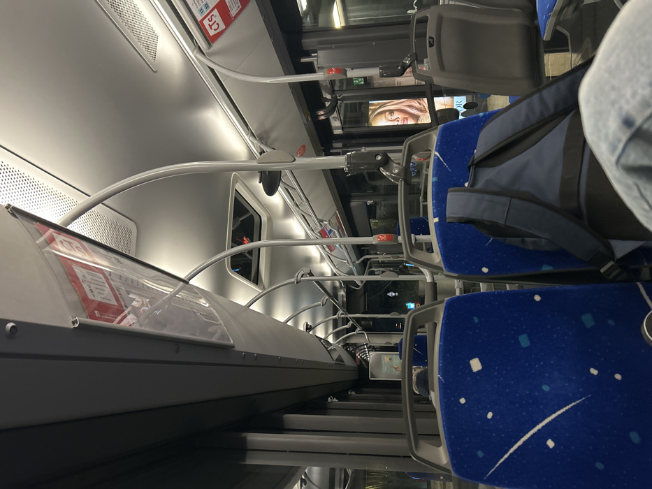 The interior of a bus is captured from an unusual perspective. The aisle stretches lengthwise, flanked by blue, patterned seats. A backpack rests on one. Overhead, grab rails extend along the ceiling. Advertisements are visible above the seats on the right. The lighting is bright and even. A window shows a blurry view of the outside night. The image gives a sense of the bus's length and the repetitive pattern of the seating.