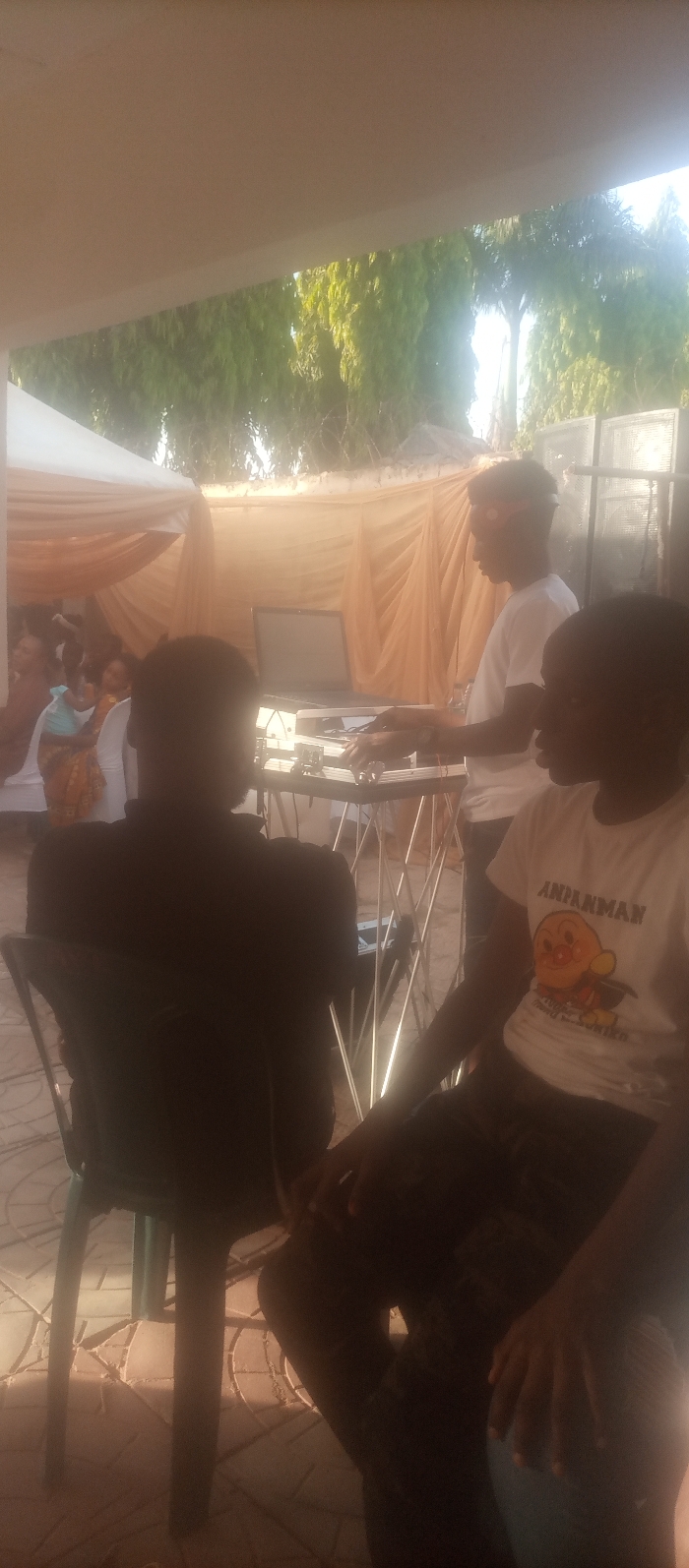 The image displays an outdoor or semi-outdoor gathering in Sabon Tasha, Nigeria. The scene is illuminated by strong natural light, casting distinct shadows. In the foreground, a person is seated with their back to the camera on a dark green plastic chair, wearing a dark shirt. To their right, another individual is seated, viewed from the left, wearing a white t-shirt with a red and orange Anpanman character and partially visible text. In the mid-ground center, a DJ stands, operating sound equipment. This individual wears a white t-shirt and headphones with an orange headband. Their hands are positioned on a silver and black DJ controller, which sits below a silver laptop on a stand. The equipment stand is constructed from crisscrossing silver-colored rods. Behind the DJ setup, large black speakers are partially visible. To the left mid-ground, a white event tent with draped orange/tan fabric is visible, beneath which several individuals are seated. These background figures include adults and at least one person holding a small child. The ground surface is paved with patterned tiles. The background beyond the tent structure reveals bright sunlight, green foliage (appearing as tall, thin trees), and a wall topped with barbed wire, suggesting a perimeter fence.