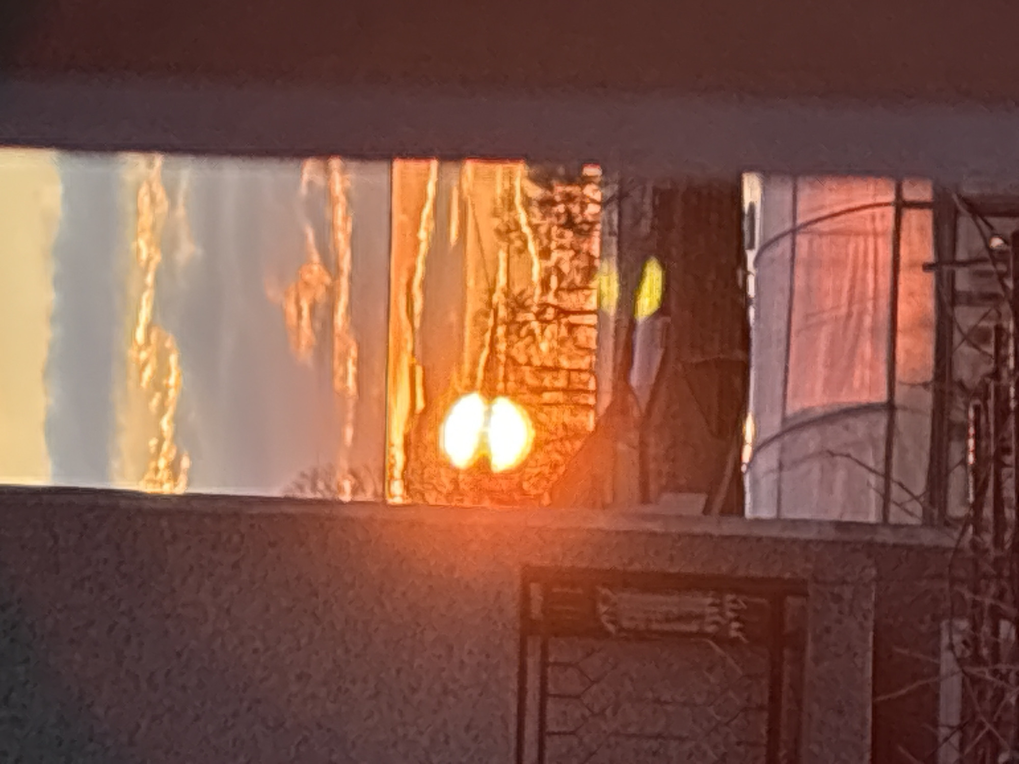 view from a window or opening, likely within a building in Stefan Karadja, Bulgaria, during sunrise or sunset. Light is coming through several vertical planes, creating an orange-red hue. Visible through the opening are buildings, vegetation, and the sky with clouds. In the foreground is a rough textured surface, possibly a wall or ledge. Further back, metal grids or fences are visible along with other structures that give the impression of an urban setting. The light and shadows suggest the time of day is near dawn or dusk.