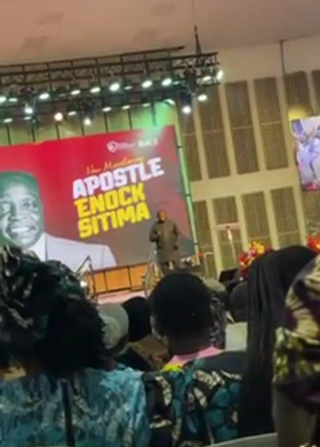 The scene takes place indoors in a large venue with a high ceiling and multiple rows of audience members facing a stage. The stage features a large screen that displays the name "Apostle Enock Sitima". A man is speaking at a podium on the stage, he is dressed in a dark suit. A row of stage lights illuminates the stage. The audience, largely composed of people of color, is partially visible in the foreground. The audience is seated and appears to be listening attentively to the speaker. There are some decorations around the stage. The environment is well-lit. The overall impression is that of a religious service or event.