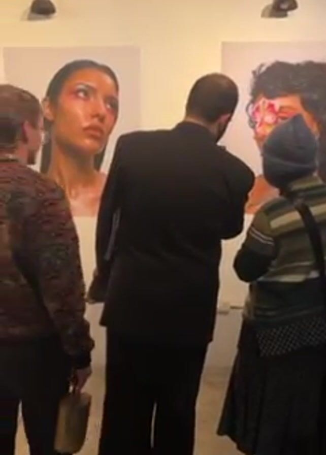 people at an art gallery, viewing portraits hung on white walls. Individuals are seen in diverse clothing, including a black suit, sweaters, and jeans. There is an air conditioner on the wall near the ceiling. There is a black door, a small round table with a candle on it, and visible pipes and fixtures. The portraits feature close-up shots of faces with unique makeup or floral adornments. The gallery is illuminated by track lighting, and people are seen talking and looking at the art.