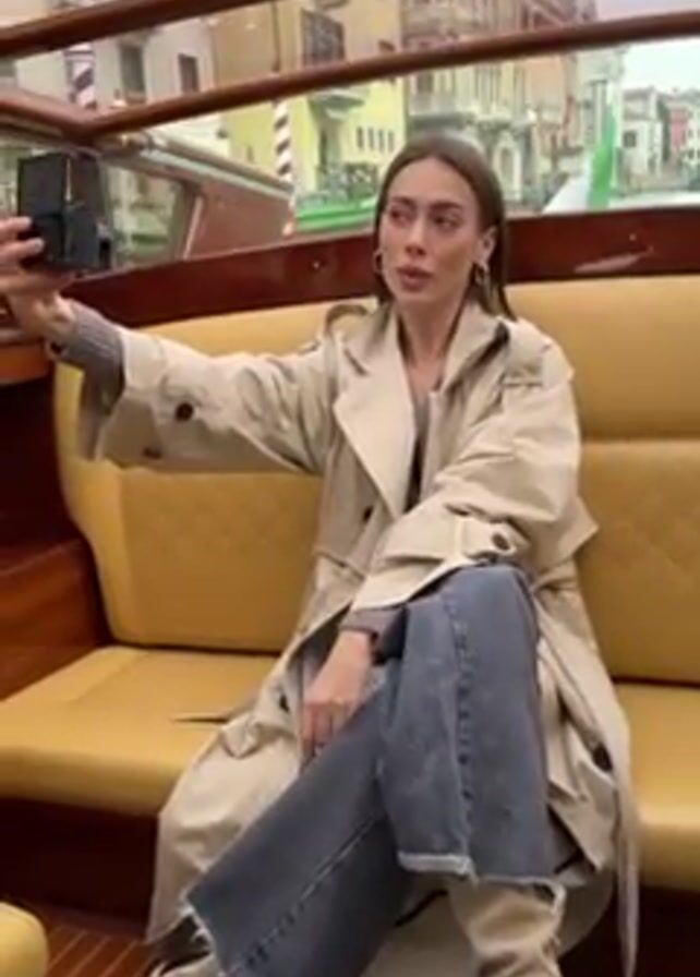 A young woman is sitting on a yellow cushioned bench inside a water taxi, her legs crossed. She wears a tan trench coat, a gray sweater, and blue jeans, along with light-colored knee-high boots. The taxi moves along a Venetian canal lined with buildings in the background. She holds a black camera, taking selfies while looking at the display screen. The taxi has a wooden interior and a clear roof allowing light to flood the cabin. The overall atmosphere suggests a stylish travel experience.