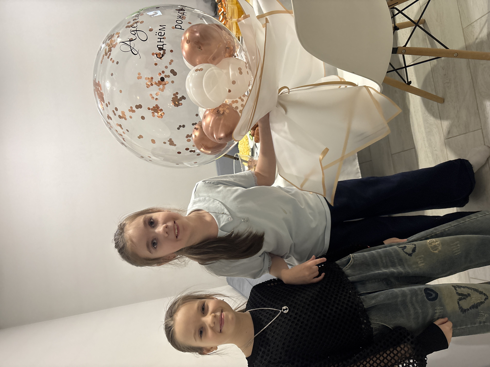 The image depicts two young females positioned indoors in Votkinsk, Russia, likely within a private residence. The female on the left, with light brown hair tied back, wears a black open-mesh long-sleeved top and light-wash jeans adorned with dark blue and gold-colored heart motifs, along with a silver chain necklace featuring a circular pendant. The female on the right, with light brown hair in a ponytail, wears a light blue short-sleeved top with a peter pan collar and dark blue trousers, also with a silver chain necklace and circular pendant. Both subjects are smiling and looking directly at the camera. A large transparent spherical balloon bouquet is centrally located between and slightly behind the individuals, resting on a white-tableclothed table. The bouquet contains smaller white and rose gold metallic balloons, along with dispersed rose gold confetti. Russian text, "Аделина с днём рождения" (Adelina, Happy Birthday), is printed on the main balloon. Its base is wrapped in white paper with gold trim. The table displays various food items and beverages, including yellow solids and orange liquids. A modern white chair with wooden legs and black metal bracing is visible to the right of the table. The background features plain light-colored walls and a light-colored floor. A muted blue fabric object is partially visible in the upper left background.
