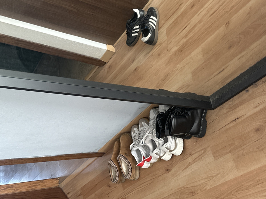 variety of footwear on a wooden floor. Two pairs of shoes are scattered on the floor near the corner. A collection of six pairs of shoes are lined up, including sandals, white sneakers with red accents, and black boots, under a dark gray ledge. The background consists of a white and light-brown surface.