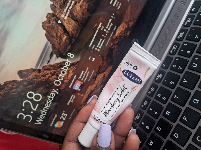 A close-up, slightly angled image captures a hand holding a tube of lip balm above an open laptop. The hand, exhibiting dark skin tone with light lavender-painted and manicured fingernails, holds a white and pink tube labeled "LURON NOURISHING Strawberry Sorbet ALL NATURAL LIP BALM," with "NEW" and "ALL-DAY PROTECTION" also visible. The lip balm is positioned over the black, QWERTY keyboard of a silver-grey laptop. The laptop's screen displays a desktop or lock screen featuring a background image of rugged, rocky terrain near a body of water. Overlaid text on the screen indicates the time "3:28" and the date "Wednesday, October 8." A weather widget on the screen displays "Ongata Rongai 23°C Partly sunny 25°/15°," confirming the location as Ongata Rongai, Kenya. Additional screen content includes details about an "Event near you" (Christafari, Kibera, DC grounds, Friday, 4:00PM, Nov 14) and "Trending in Premier League" results. A red object is partially visible in the upper left background.