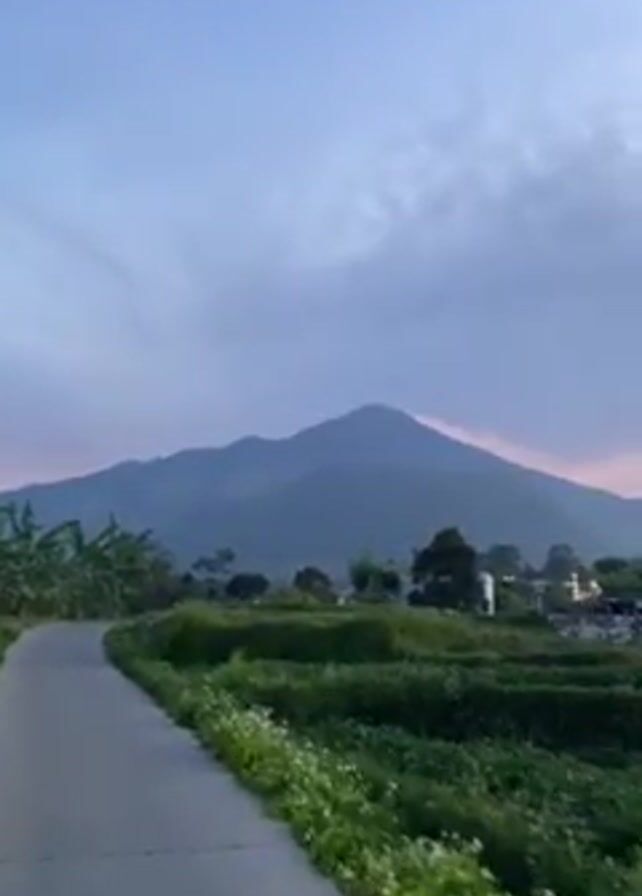 The video captures a scenic view of a mountain range at dusk or dawn. A gray paved road runs alongside lush green vegetation, possibly fields or gardens. On the left side of the road, there are banana trees. In the distance, a mountain looms, partially obscured by cloud cover, against the sky that is painted in soft shades of blue and pink. There are some houses and trees interspersed within the green landscape in the middle ground. The video slowly pans to the right, shifting the focus from the mountain to the surrounding landscape.