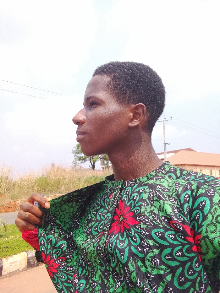 The image depicts a young male individual, dark-skinned with short dark hair, shown in profile, looking towards the right side of the frame. He is wearing a dark-colored, possibly black, traditional-style shirt or tunic adorned with a vibrant pattern of green foliage and prominent red floral motifs, featuring a band collar. His right hand is seen pulling open the left side of the shirt. The scene is outdoors in Awkuzu, Nigeria, under an overcast or brightly lit sky. The background includes tall, dry grass or vegetation, a visible utility pole with wires, and a partial view of a building with a reddish-brown tiled roof. A section of a road or path with a concrete curb is visible in the lower-left foreground.