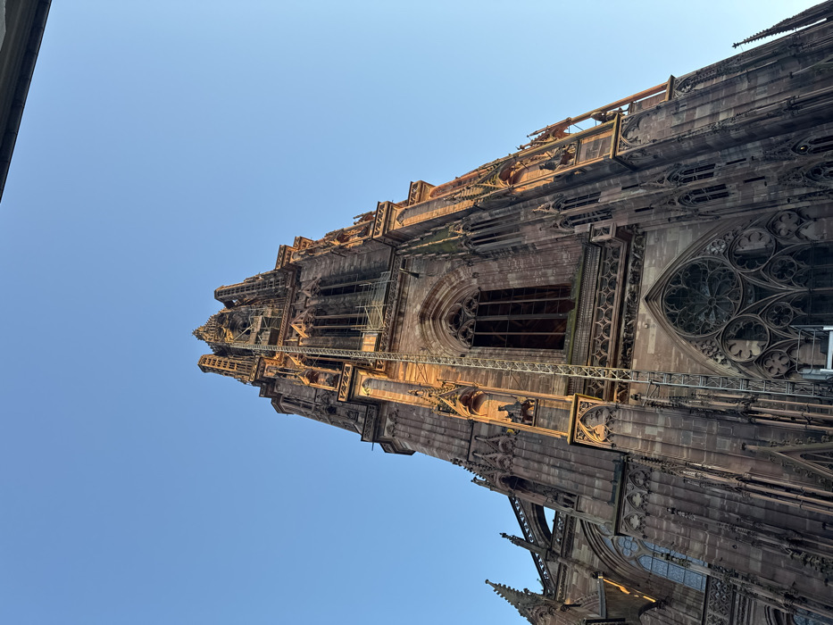 The image depicts the Cathédrale Notre-Dame de Strasbourg, located in the city of Strasbourg, France. The perspective is a low-angle shot, looking up at the cathedral's imposing reddish-brown sandstone facade and its primary tower, which dominates the frame and extends towards a clear blue sky. The Gothic architecture features intricate detailing, including multiple pointed arch windows, decorative tracery, flying buttresses, and numerous sculptures within niches. Golden hour sunlight illuminates the upper sections of the tower and the eastern side of the structure, highlighting the texture of the stone, while other areas are cast in shadow. Prominent scaffolding, composed of a metallic framework, is visible ascending the main tower, indicating ongoing maintenance or restoration work. A large circular rose window, or a similar large ornate window, is partially visible towards the bottom-center of the frame, underneath one of the larger pointed arch windows. No individuals or active interactions are discernible within the scene. A dark, indistinct edge, possibly part of an overhead structure, is present along the very top right edge of the frame.