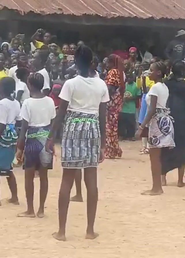 A group of young people wearing white shirts and colorful skirts are performing a dance in a dirt area in front of a large crowd of people. The crowd is standing under a rusty tin roof and partially under a white tent with a red drape. The dancers are barefoot. A few other children are standing off to the side of the dance group. There is a table with some decorations to the left of the dancers.
