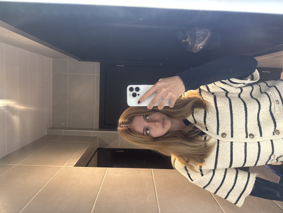 The image depicts a female individual taking a mirror selfie in an indoor setting, likely a modern restroom or changing room located in the city of Bruges, Belgium. The precise address or type of establishment within Bruges is not discernible from the image. The subject is a woman with long, straight light brown hair, parted in the middle with curtain bangs. She has a neutral expression, looking slightly to her right. She is wearing a black long-sleeved shirt, covered by an open, short-sleeved, cream-colored, textured jacket with horizontal black stripes and five visible brown buttons down the front. Small pockets are present on the lower front of the jacket. Her left hand, adorned with a silver-colored ring on the ring finger and dark red nail polish, holds a white-cased smartphone, capturing the reflection. The environment reflected in the mirror consists of walls and ceiling tiled with large, light gray/beige rectangular tiles. Reflections of overhead lighting are visible on the ceiling. To the left, a dark doorway or opening is partially visible. To the right, a darker wall or door segment is present, alongside a narrow vertical light strip. A clear plastic bag, possibly containing a waste bin, is also visible in the lower right background.