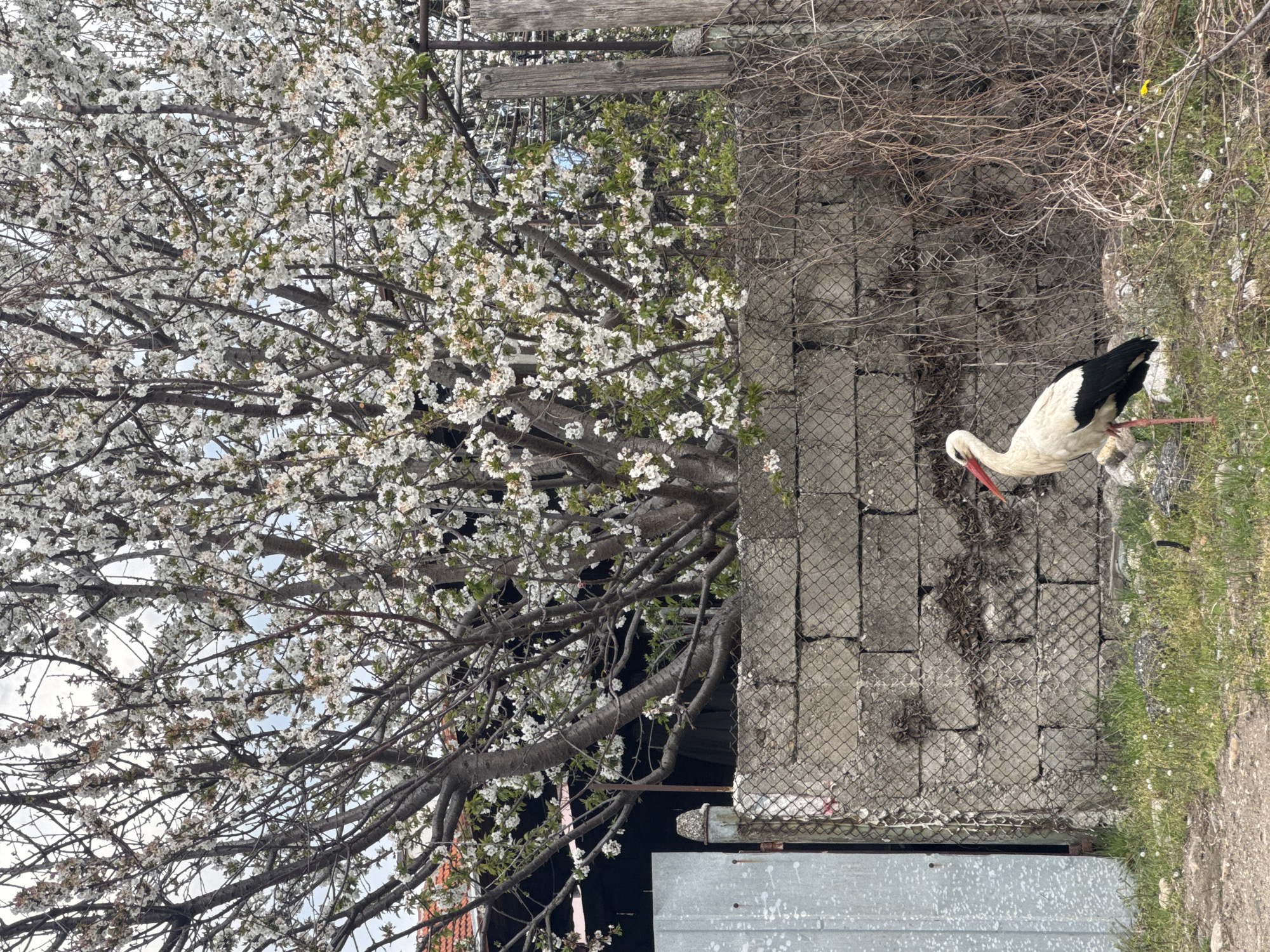 A white stork (Ciconia ciconia) stands on the ground next to a weathered grey concrete wall with a wire mesh screen attached. The ground is covered with dry vegetation and patches of green grass. A tree with white blossoms is visible to the left of the wall. A silver metal object is below the wall. The scene is situated in Porominovo, Bulgaria.