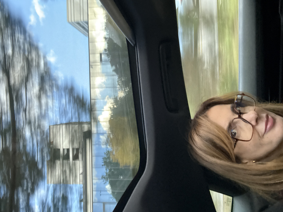 An image taken from inside a car, featuring a woman wearing glasses who is partially visible