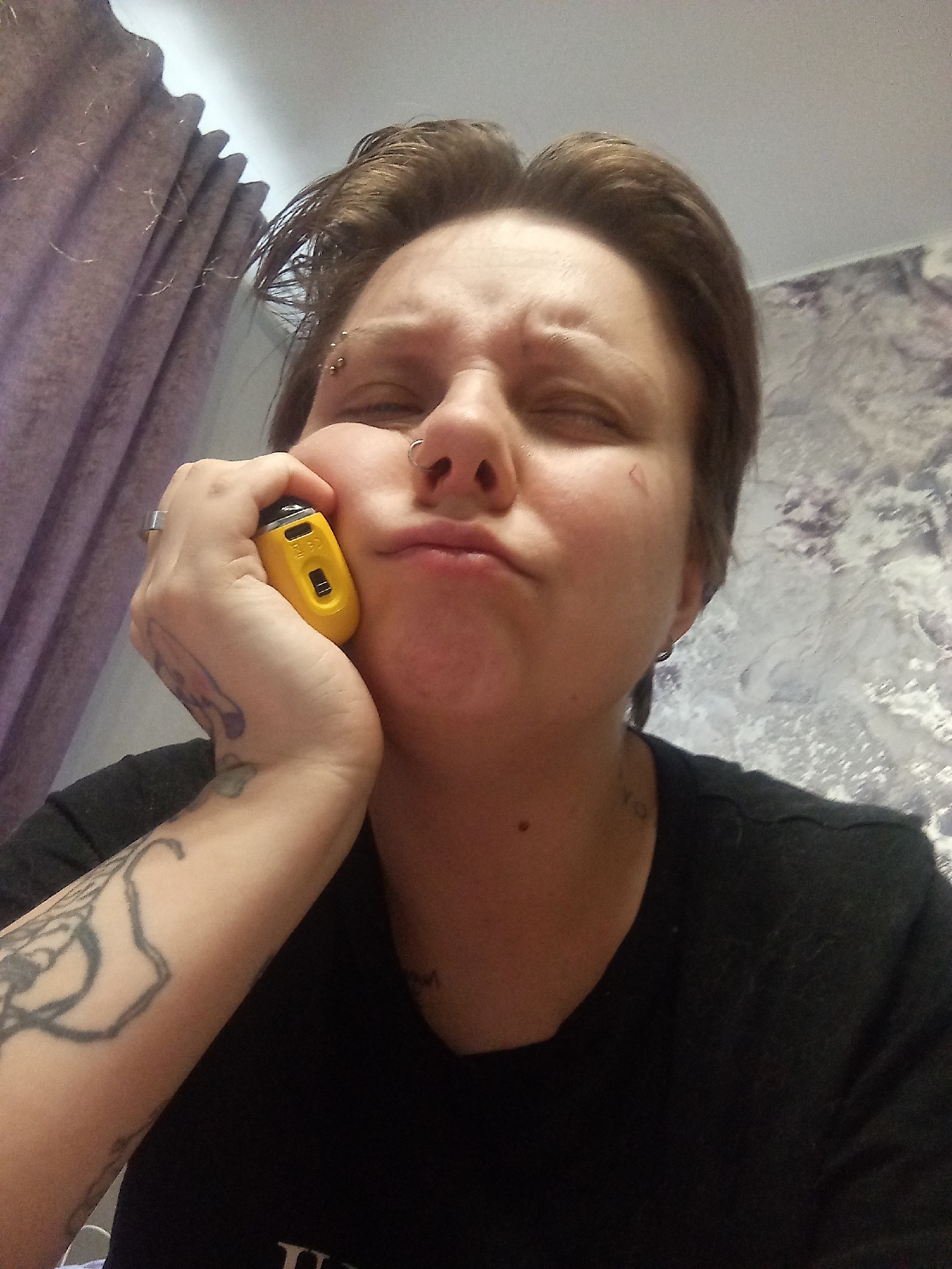 An individual is depicted in a close-up, indoor setting. The person, with short, brown, somewhat disheveled hair, is shown from the chest up. They have their eyes closed, lips slightly pursed in a pouting expression, and cheeks puffed out. Piercings include multiple small studs on the left eyebrow and a silver-colored septum ring in the nose. A small, dark, heart-shaped marking is present on the right cheek. The individual wears a black long-sleeved top. A prominent dark-ink tattoo with abstract or floral elements is visible on the left forearm, and a small, faint symbol is on the neck/collarbone area. A silver-colored ring adorns the ring finger of the left hand. The left hand holds a small, bright yellow electronic device, possibly a portable vaporiser or similar gadget, against the left cheek. The device features a black button or switch on its front surface. The background consists of a dark purple or greyish-purple pleated curtain on the left side, and a wall with light-colored, abstractly patterned wallpaper on the right side. A plain white ceiling is visible at the top of the frame. The lighting appears to be interior and overhead. No specific location within Saratov, Russia, can be determined from the visual information presented in the image; the scene is consistent with a residential interior.