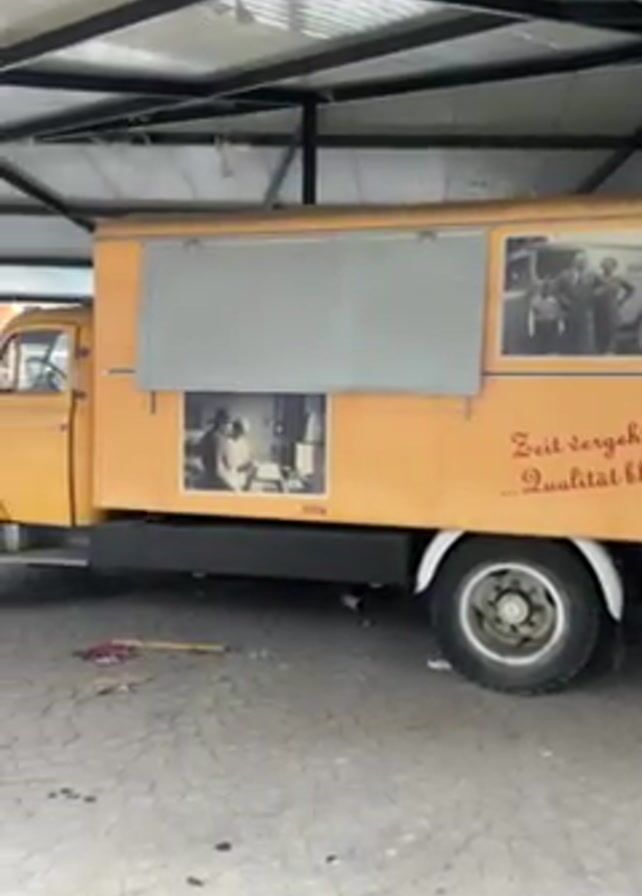 yellow truck parked under a metal structure with a corrugated roof. The truck has a large panel on its side that slides up, and there are black and white photographs of people and text in German on the side of the truck. The truck is parked on a patterned stone surface. In the background, through the metal structure, there are glimpses of modern buildings and other cars, including a pink Volkswagen Beetle. The camera slowly pans from right to left, showing the truck and the surrounding area.