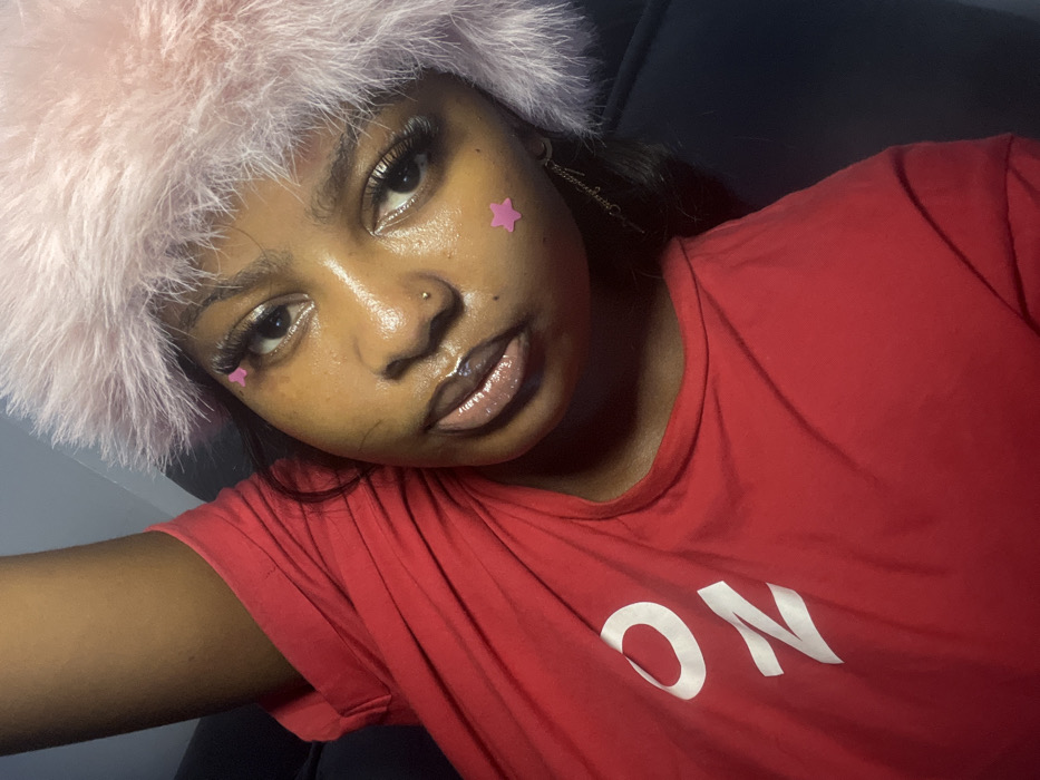 An individual is depicted in a close-up, portrait-oriented image, captured from a slightly elevated angle. The subject is a young person with dark skin, wearing a bright red short-sleeved t-shirt with white text, partially reading "ON," visible on the left chest area. A light pink, fluffy faux-fur hat covers the upper portion of the head. The individual has a small silver stud piercing on the left nostril. Both cheeks feature small, pink star-shaped stickers; one is below the left eye, and another is positioned on the right cheek. Long, dark eyelashes are prominent, with visible glossy lips and shimmery eyeshadow. A dark, chain-link earring or similar accessory is visible on the right side of the face, partially obscured by dark hair. The subject's left arm is raised and partially visible in the upper left corner of the frame. The background is indistinct and dark, indicating an indoor setting, possibly against dark furniture. The location, as specified, is Badore, Nigeria.
