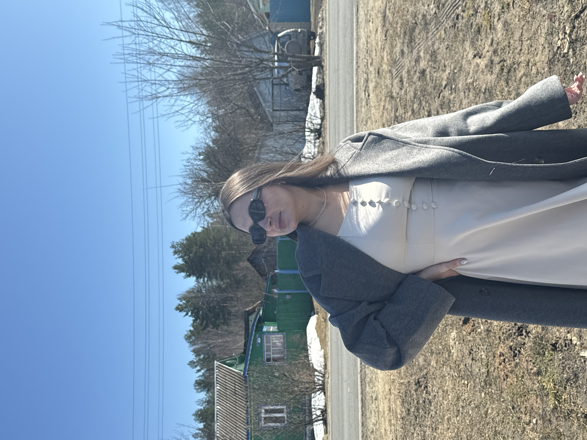 A woman wearing sunglasses, a cream-colored dress with buttons, and a gray coat is standing outdoors on a sunny day. The setting appears to be in a rural or semi-rural area of Красный Маяк, Russia, indicated by the presence of aged wooden houses with green paint, a road, bare trees, and a patch of ground covered with dry vegetation. A car and some utility lines can be seen in the background.