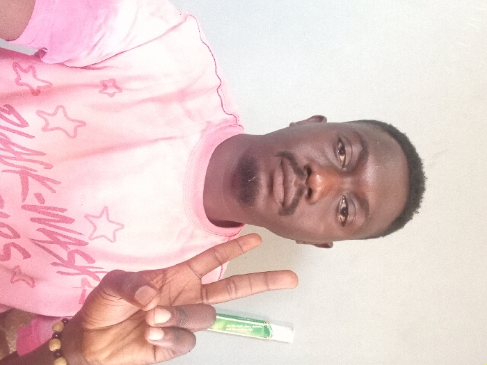 A man in a pink, star-patterned t-shirt poses, giving a peace sign. A beaded bracelet adorns his wrist. The individual has short, dark hair and a mustache. A rectangular, green and white object is visible near his hand. The background appears to be a plain wall. The image appears to be taken at an angle, possibly a selfie.