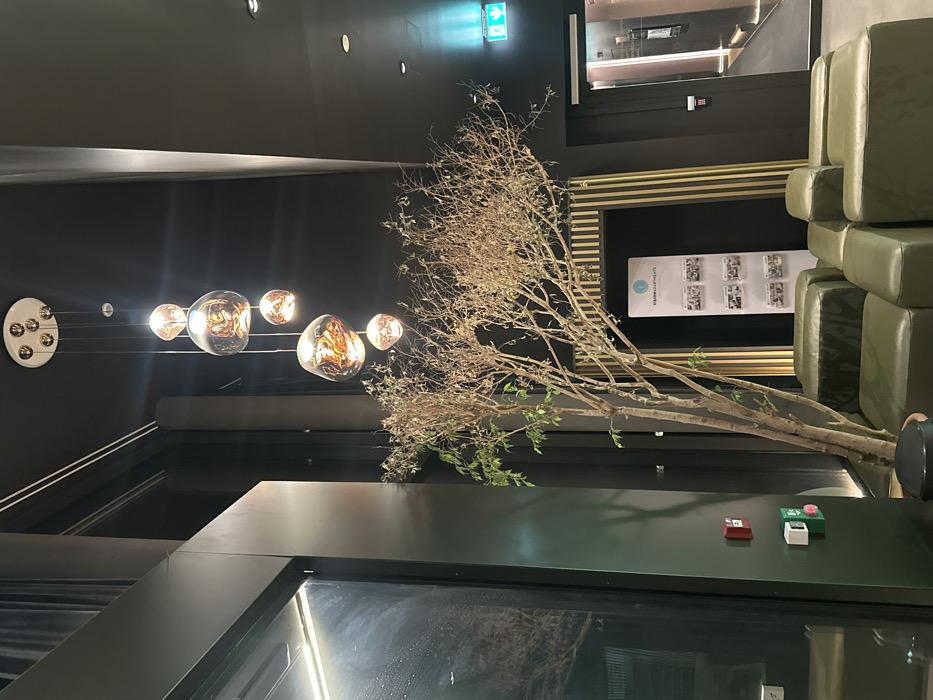 This image captures a modern, interior space, consistent with a lobby or common area in Glattbrugg, Switzerland. The scene is dominated by a high ceiling and dark walls. A contemporary chandelier descends from the ceiling, featuring a polished chrome base and six irregularly shaped, amber-hued glass light fixtures suspended at varying lengths. Below the chandelier, a tall, potted tree with mostly bare, light brown branches stands; a few clusters of green leaves are visible near its trunk. Adjacent to the tree, a dark green, modular leather seating arrangement forms an L-shape on the dark floor. Directly behind the seating and tree, a rectangular opening is framed by vertical gold and dark striped panels. In front of this archway stands a white, upright display board labeled "VISION APARTMENTS" at its top, featuring multiple small photographic squares below the text. On the far right, a dark, reflective doorway leads into a dimly lit corridor. Above this doorway, a green emergency exit sign with two white arrows pointing right is illuminated. On the left side of the image, a tall, dark-framed glass panel or window is visible. Mounted on the adjacent dark wall are a red square control unit positioned above a smaller white and green control unit, likely a fire alarm or emergency call point. The overall environment is illuminated by artificial light sources, including the chandelier, recessed ceiling lights, and the emergency sign. No individuals are present in the scene.