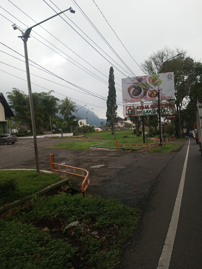 The image depicts an outdoor scene in Sandamal Eliya, Sri Lanka, under an overcast sky. The foreground features a dark asphalt roadway with a solid white line marking the right edge, where a portion of a white truck is visible, oriented away from the viewer. To the immediate left of the roadway, an overgrown grassy area contains an orange metal barrier curving into a shallow drainage ditch. Further left, a tall grey utility pole equipped with two dual-head streetlights stands prominently, supporting multiple overhead power lines that traverse the upper frame. Midground elements include a paved intersection or parking area to the left of the utility pole, where a silver SUV is parked. Behind it, a two-story building with white and brown architectural details is partially visible. Central to the midground is a grassy median or park-like space with additional low orange metal barriers. A slender, tall coniferous tree stands in this area. Dominating the right midground is a large billboard displaying food advertisements, featuring images of fried chicken and a sauce, with text in Indonesian that includes "Jadilah Tamu Kami!" and "AYAM GORENG LALAPAN BUKA." The background shows dense green foliage, palm trees, and scattered residential-style buildings. Hills or mountains, partially obscured by atmospheric haze or clouds, rise in the distance. Several additional streetlights are visible further down the road. No individuals are explicitly visible in the scene.
