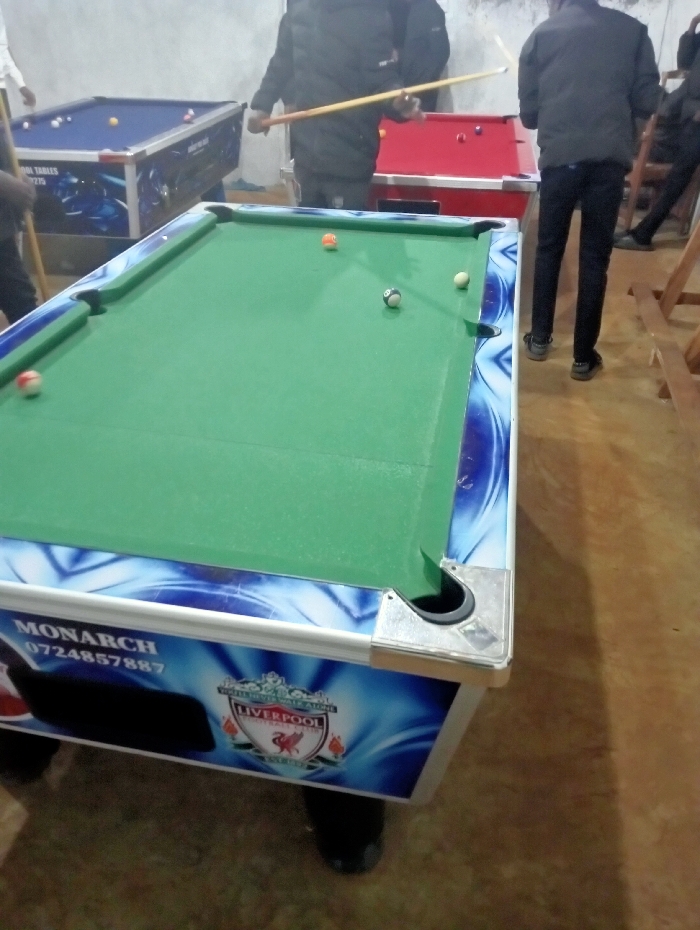 A billiards table with a green surface dominates the foreground, featuring balls scattered across it. The table's base displays a blue and white design, branded with "MONARCH" and a Liverpool FC logo. Behind it, a red and a blue billiards table are partially visible, each with balls on their surfaces. People are seen playing, with one holding a cue stick. The floor is light brown, and the overall lighting appears dim.