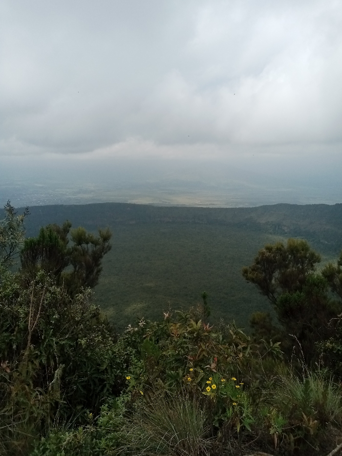 A panoramic view from a mountain's edge showcases a vast, lush valley filled with a dense, green forest. The foreground is dominated by shrubs, grasses, and small yellow flowers. In the distance, a hazy sky obscures the horizon, blending into a flatter landscape possibly containing a city. The overcast sky suggests a damp or cloudy day. The image captures a sense of natural grandeur.