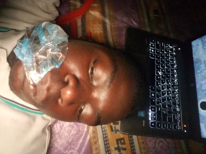 A person is lying down with an ice pack on their eye. The person appears to be resting or in discomfort. Next to them is a laptop with a lit keyboard. The background is comprised of patterned bedding and other indistinct objects. The scene suggests a moment of rest or recovery while possibly still engaging with technology.