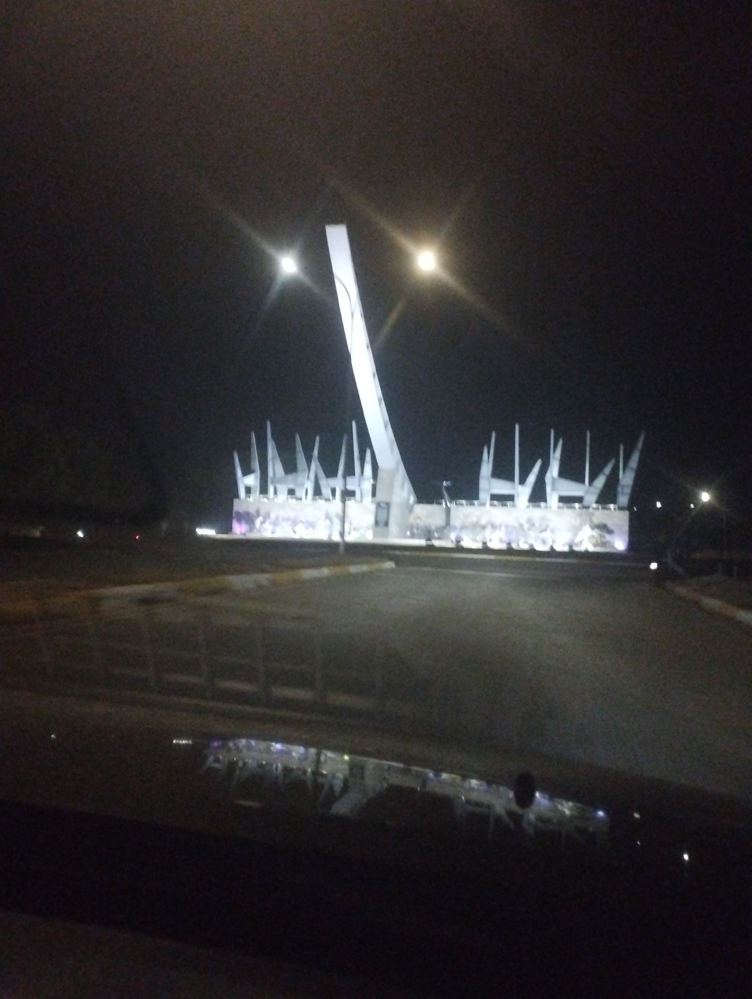 nighttime view of a monument in Campo Carabobo, Venezuela. The monument features a tall, curved white tower and a lower section with several vertical white structures resembling spikes or spears. The monument is illuminated, creating a bright contrast against the dark sky. The background is mostly dark, with faint lights suggesting other buildings or infrastructure in the distance. The foreground shows a paved road, with reflections visible on the surface. The photo appears to be taken from inside a vehicle, as part of the dashboard is visible at the bottom of the frame.