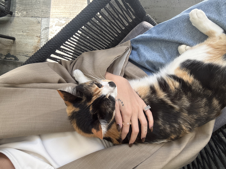 A calico cat rests on the lap of a person in an outdoor or semi-outdoor setting in Ciudad López Mateos, Mexico. The person, viewed from the upper torso to the thighs, wears a light-colored top, a tan pinstriped blazer, and blue denim jeans. Their right hand, with dark-painted fingernails, a silver-toned multi-band ring on the ring finger, and a three-dot tattoo on the inner wrist, cradles the cat. The cat exhibits black, orange, and white fur patches, and appears relaxed with its eyes closed. A dark, woven patio chair and a light-colored stone or tiled floor are visible in the background.