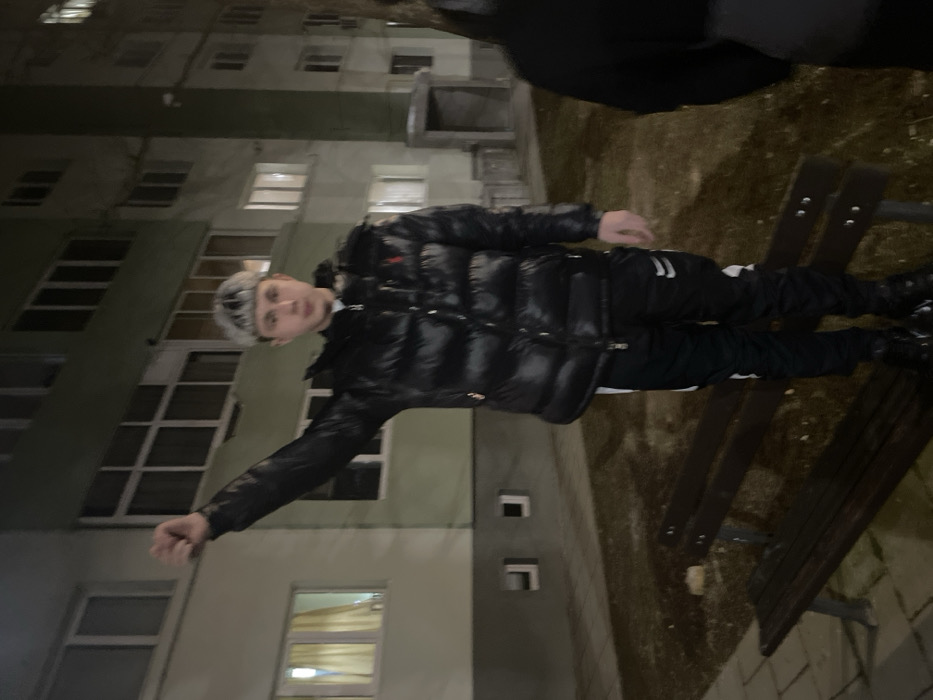 The image depicts a nighttime scene in Botevgrad, Bulgaria. A young adult male stands centrally, positioned with one foot on a dark wooden park bench and the other leg poised, facing directly towards the viewer. He has short, light-toned hair and is dressed in a black, puffy winter jacket with a red logo on the left chest, black athletic pants featuring white Nike swoosh branding on the lower legs, and black shoes. A light-colored hat, possibly fur-lined, is worn on his head. His right arm is extended upwards and slightly forward, with the hand clenched into a fist. His left arm hangs by his side. A second individual is partially visible on the far right, out of focus, wearing dark clothing and appearing to be facing away or at an angle. The background features a multi-story apartment building with a light green-grey facade and numerous illuminated windows. The ground in the foreground consists of paved sections and areas of sparse, dry vegetation. The visible park bench has dark wooden slats and metal supports.