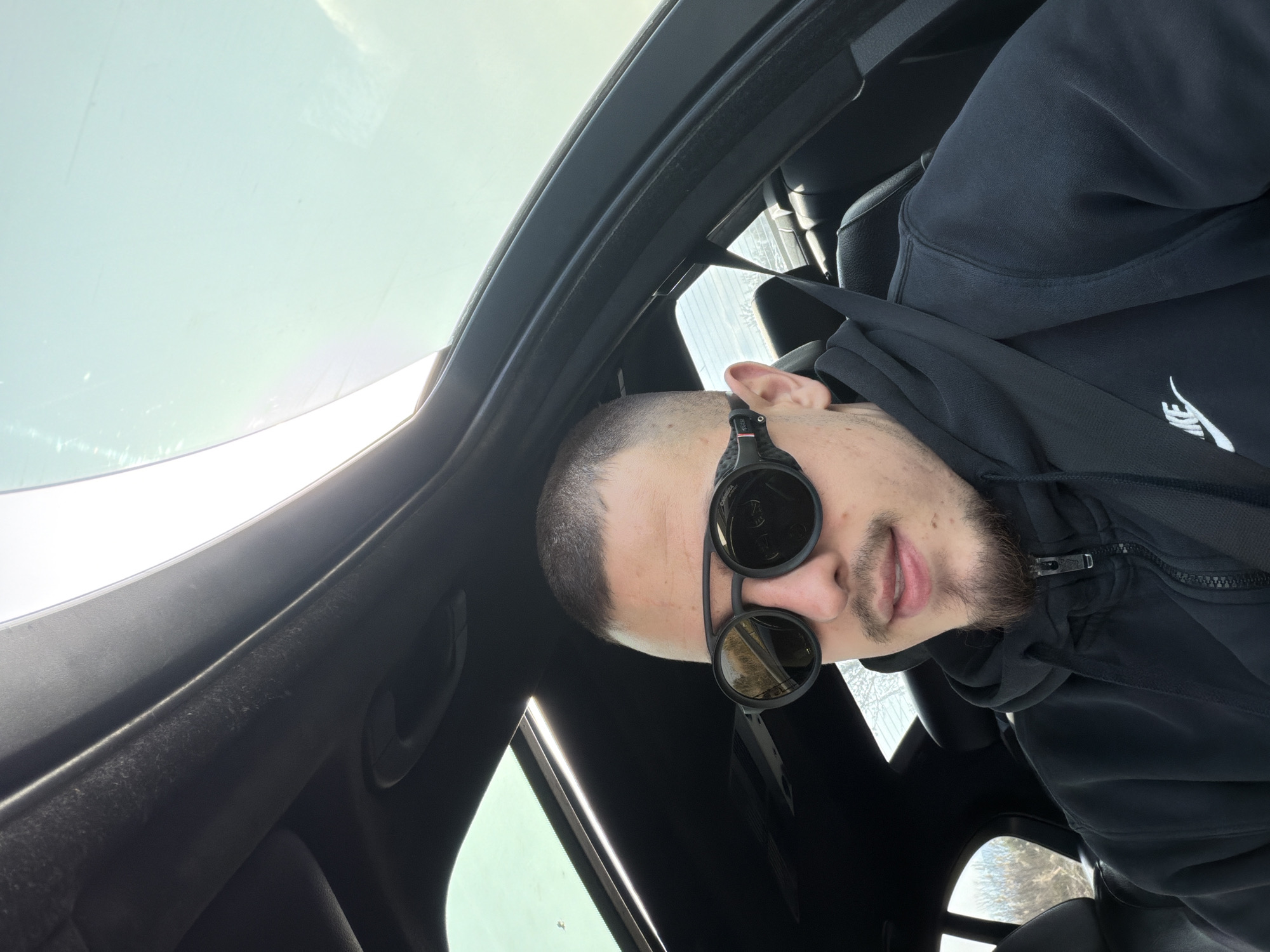 A man is sitting in a car, wearing a black hoodie with a white Nike logo, and sunglasses with a distinctive design featuring round lenses and a visible frame structure