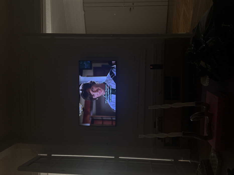 A television mounted on a wall displays a scene from a show or movie, featuring a person with dark hair wearing a collared shirt. Subtitles are visible on the screen. The room is dimly lit, with a window letting in some light at the bottom. In the foreground, there's a shiny metal object with a twisted design resting on a pink box. A dark bag is visible in the upper right corner.