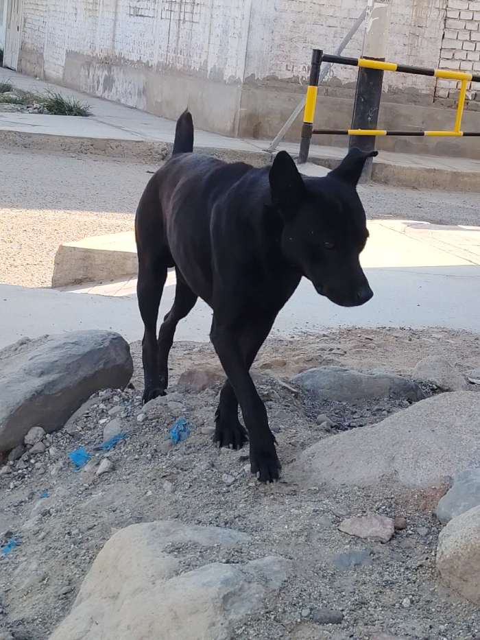 This image captures an outdoor urban or suburban scene in La Esperanza, Peru. A lean, short-haired black dog is the primary subject, positioned centrally and walking from left to right across uneven terrain. The dog has erect, pointed ears and its tail is held in an upward curve; its head is lowered slightly, facing right. The immediate foreground and midground consist of light brown dirt and gravel mixed with various sizes of light-colored rocks, among which fragments of blue plastic debris are visible. In the background, a concrete sidewalk or raised platform is present, beyond which a light-colored brick or concrete block wall, showing signs of wear and plaster deterioration, is visible. To the right, a black and yellow striped barrier post or gate structure stands. The scene is illuminated by daylight.