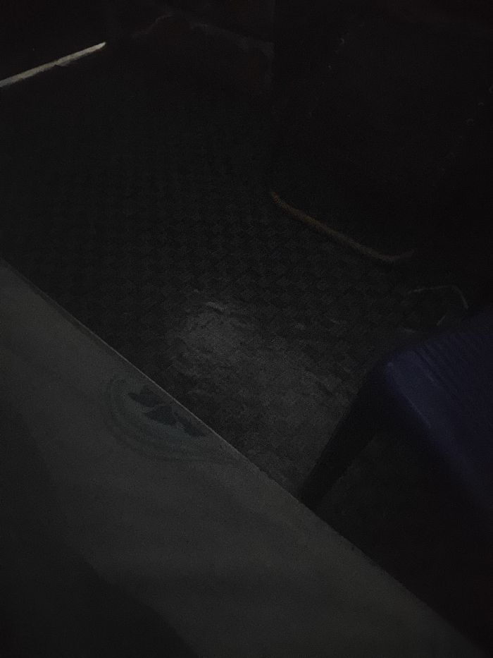 The image is a close-up shot of a dark, textured surface. There is a faint outline of what appears to be a blue object in the lower right corner. It is impossible to determine the exact location or nature of the objects due to the poor lighting and lack of detail in the image.
