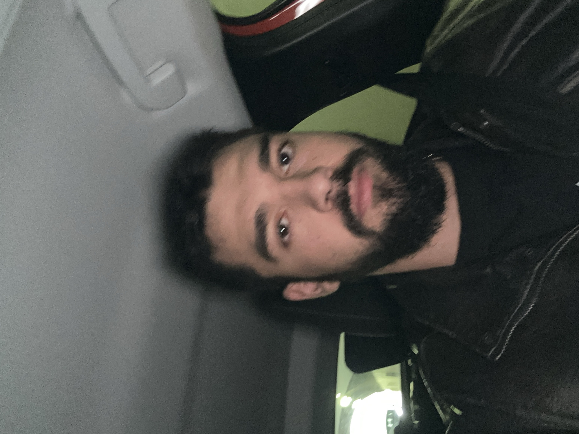A man with a dark beard and jacket is inside a vehicle. The interior of the car is visible, including the ceiling and a window showing an indistinct outdoor scene. The location is not determinable from the image.