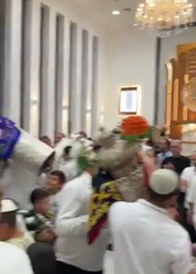 crowd of people, mostly men and boys wearing yarmulkes, moving through a brightly lit room with white walls and large windows. Several men are carrying ornately decorated objects, possibly Torah scrolls, adorned with flowers and fabric. People are talking, singing, and seem to be celebrating. The setting appears to be a synagogue or religious gathering space with a prominent chandelier and decorative woodwork.
