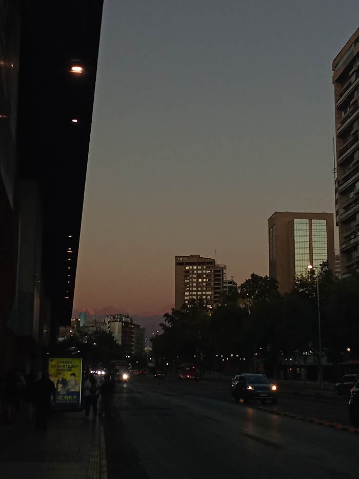 A city street at dusk is lined with tall buildings on both sides. The sky is a blend of muted orange and grey. Several cars with headlights on are driving on the road. People are walking on the sidewalk alongside a billboard advertising "un sol de ventajas jamas". In the distance, a glimpse of mountains is visible behind some buildings. Artificial lights glow on a nearby building.