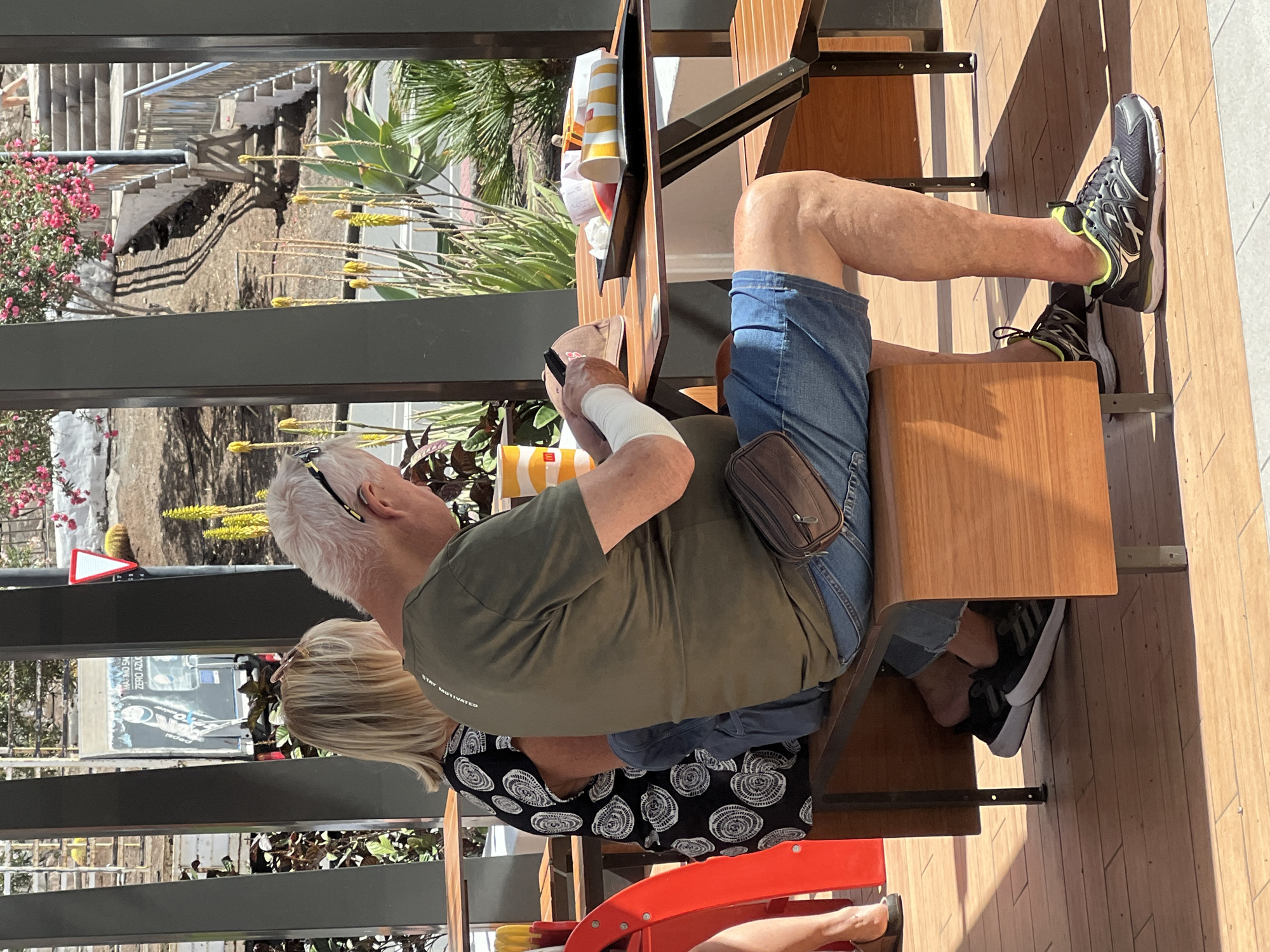 The scene depicts an outdoor dining area, likely a fast-food establishment, under bright daylight conditions in Puerto Rico, Gran Canaria, Spain. Two individuals are seated at a wooden slatted table with an integrated bench. A male, appearing middle-aged to elderly, with white hair and sunglasses pushed up on his head, is seated on the right side of the table. He wears an olive green t-shirt with "STAY MOTIVATED" text partially visible on the shoulder, blue denim shorts, and dark athletic shoes with lime green accents. A brown fanny pack is secured around his waist. His left forearm is covered by a white sleeve or bandage. He is observed holding a small, dark object, possibly a mobile phone or wallet, over a light brown baseball cap positioned on the table. To his left, a female, also appearing middle-aged, is visible from the back. She has blonde hair and wears a black and white patterned dress or top. Her feet, clad in black athletic shoes with white soles, are visible beneath the bench. A red chair or structure is partially visible to the far left, along with a person's lower leg and foot wearing a brown shoe. On the table in front of the male, a black plastic tray contains fast-food items, including an upright yellow and white striped cup with an "M" logo, another yellow and white striped cup lying on its side, a red container, and white tissue paper. Another yellow and white striped cup is situated on the bench to the male's left. The ground consists of light brown tiled flooring. The background features lush vegetation, including tall, spiky plants with yellow flower stalks and bushes with pink blossoms. Grey vertical structural pillars frame the outdoor area. In the distance, a dry hillside with a concrete staircase and metal railings is visible. A red triangular warning sign and a faded poster displaying "ZERO AZÚCAR" (Spanish for "Zero Sugar") are discernible in the background, consistent with a Spanish-speaking European territory.