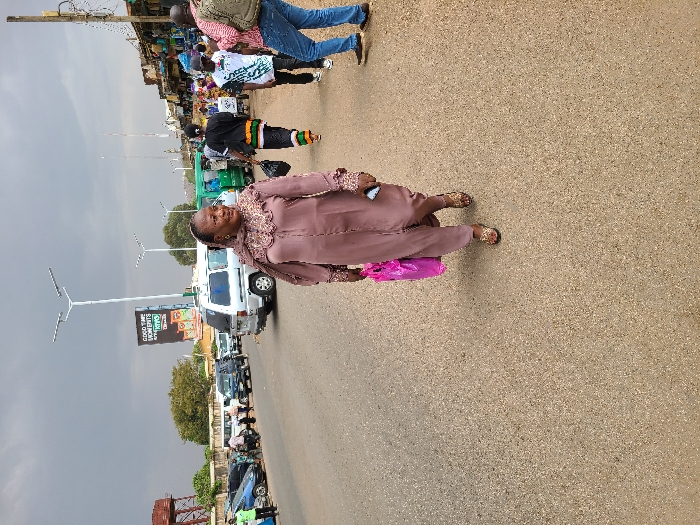 The image captures a busy street scene in the city of Unknown, Unknown, under a uniformly overcast, grey sky. A paved asphalt road, speckled with light-colored aggregate, dominates the foreground and midground. A woman is prominently featured in the center foreground, walking towards the viewer but looking towards the right. She wears a long, light brown/mauve dress with embroidered detailing on the neckline and cuffs, a matching headscarf, and gold-colored sandals. She holds a bright pink shopping bag in her left hand and a light-colored mobile phone in her right. On the left side of the road, several vehicles are parked, including dark blue and light blue cars. A brown water tower on a metal scaffold stands behind them, partially obscured by trees. A large billboard with the text "GOOD TIME MOMENTS" and "MILK" is visible above the parked cars. On the right side of the road, multiple individuals are walking. A person in a black shirt with a multi-colored horizontal pattern walks away from the viewer, followed by another in a white t-shirt. Further forward, a man in a red/orange plaid shirt, blue jeans, and a green backpack walks towards the viewer. A silver minivan drives away on the road, with a green motorized tricycle (keke napep) visible behind it. In the background on the right, a row of multi-story buildings, appearing as shops or market stalls, lines the street. Several tall streetlights with multiple LED panels are present along the thoroughfare.